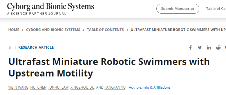 该研究以论文的形式发表在中国科技期刊卓越行动计划高起点新刊Cyborg and Bionic Systems上,标题为Ultrafast miniature robotic swimmers with upstream motility。