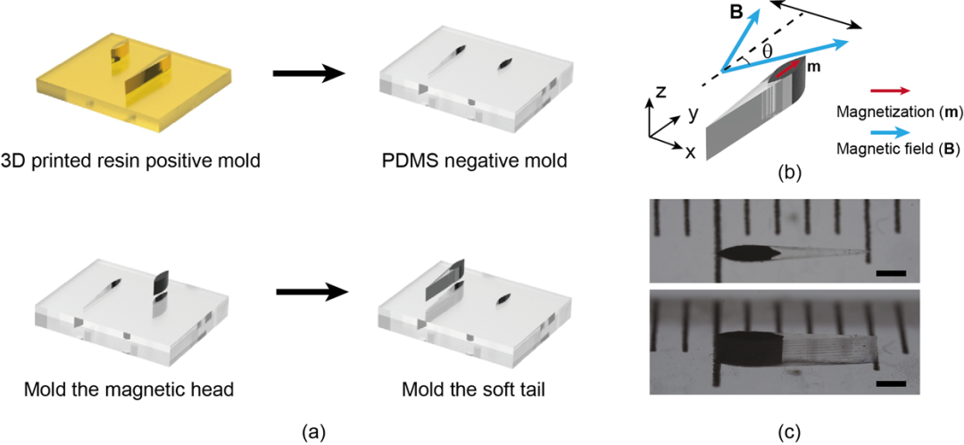 为了实现最大程度上的仿生,研究人员将其设计成流线型结构,鱼身由聚二甲基硅氧烷(PDMS)和钕铁硼微粒的混合物铸造而成,而鱼尾巴由PDMS材料制成。为了适应人体的生物环境(人动脉血管直径不超过1 cm,厚度为1 mm左右),磁驱软体鱼的长度仅为 5 mm,非常小巧。