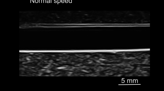 从下图可以看出,磁驱软体鱼可以在超声成像下游过血管。
