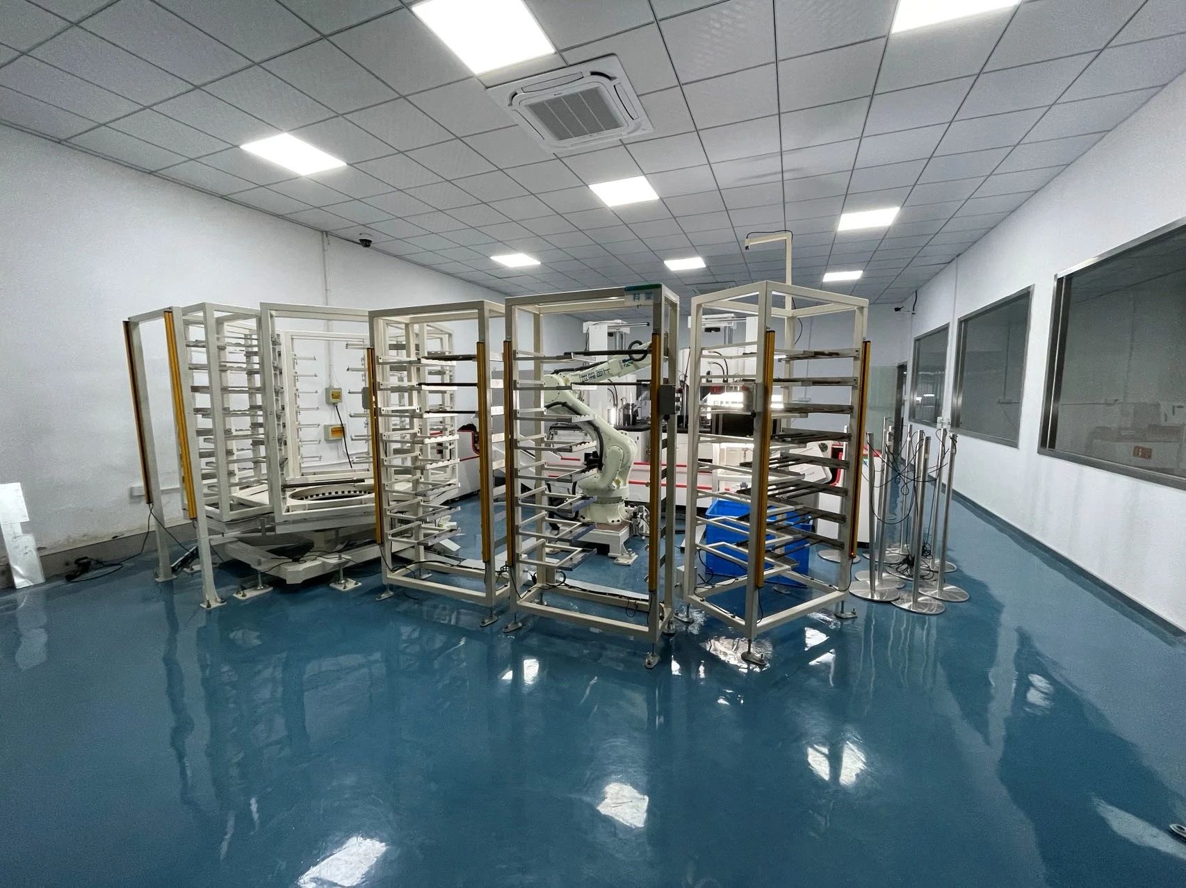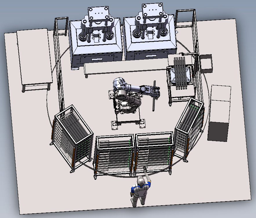 机器人钢筋拉伸工作站是一种利用机器人为移载主体,提供钢筋自动取料、测量长度、称重、测量钢筋拉伸强度并将信息上传到对应信息系统的一体化检测系统。解决了在钢筋检测行业需要人工取件、称重、人工摆放拉伸并输入到信息系统的问题,能够有效的提高钢筋拉伸自动化水平及减少人工劳动强度,本产品可应用在钢筋检测行业的自动化生产中。