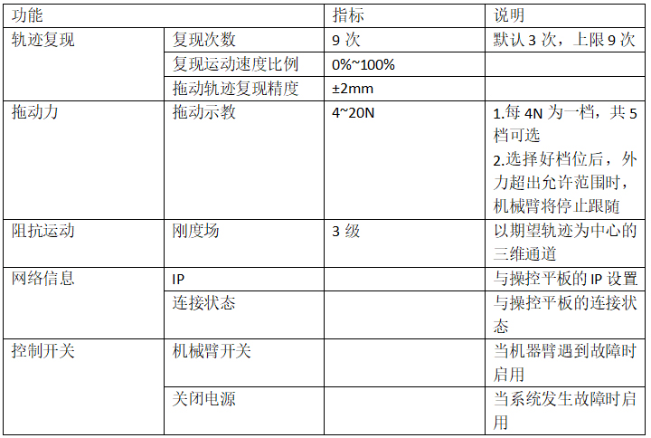 ●阻抗运动功能:当机械臂按照被记录的轨迹复现运动过程中,如果有与期望运动方向相反的力(一定范围内的力)作用,系统会有阻抗力,以尽可能保证-致的复现轨迹被记录。
